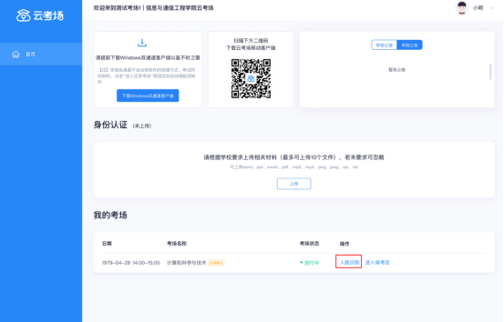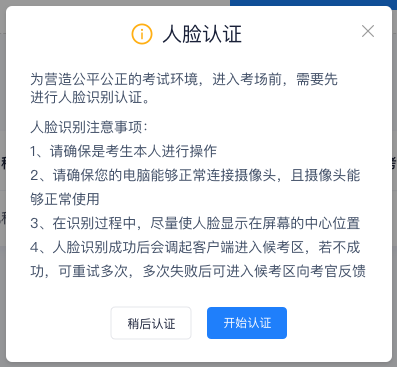a. 考试开始时,考生需要点击“人脸识别认证”按钮进入,需要允许获取摄像头权限