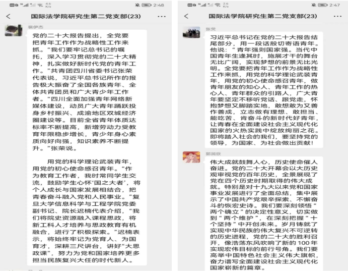 为深入学习领会党的二十大精神,推动党的二十大精神落地落实落细,引导党员学在深处、干在实处,成人电影 研究生第二党支部于10月30日通过线上方式召开党的二十大精神学习讨论会。会议由支部书记龙旭洋主持,全体党员参加。
