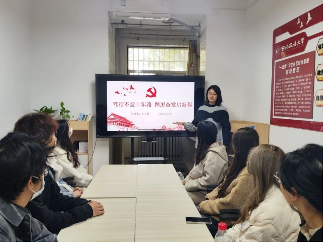 为深入学习宣传贯彻党的二十大精神,深刻领悟高质量发展内涵要义,12月1日,成人电影 学生第一党支部在学生公寓2号楼思政工作站开展“笃行不怠十年路,踔厉奋发启新程”新时代十年伟大变革宣讲活动。