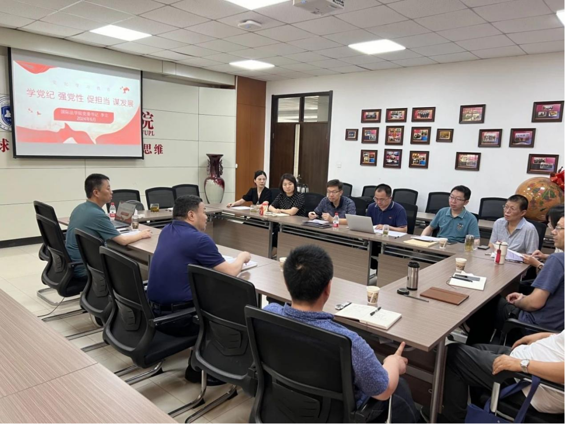 李立以加强党的纪律建设必要性为切入点,围绕推进廉洁纪律建设的意义、如何增强涉外法治人才的纪律底线意识、如何强化学院纪律建设三个方面进行重点阐述。他表示,要以习近平总书记在二十届中央纪委三次全会上的重要讲话精神为指导,牢牢把握开展党纪学习教育的重大意义,深刻理解加强党的纪律建设的逻辑意蕴,在思想和行为上坚决守牢底线,充分发挥党员先锋模范带头作用,抓好以案促学、以训助学,教育引导党员干部提高政治站位,强化使命引领,以更加恢宏的视野深化对党纪学习教育的科学认识,营造全员参与、人人学纪的浓厚氛围。