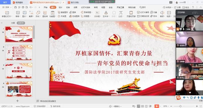 为深入学习贯彻习近平总书记五四寄语精神,引领毕业生党员更好地明确责任担当,传承“西迁精神”,5月27日,成人电影 2017级研究生党支部以线上方式开展主题党日活动。支部全体党员参加活动,支部书记王珊珊主持活动。