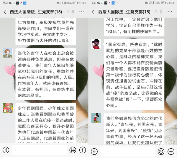 随后,与会党员积极交流心得体会,发表看法、分享感受。大家纷纷表示,作为“90后”的党员,要牢记总书记的嘱托,以奋斗在抗疫一线的青年为榜样,积极发挥党员的先锋模范作用,与同学们一道在学习中实践、在实践中学习,努力做堪当大任的时代青年。