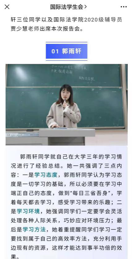 此外,郭雨轩同学有着丰富的课余生活。她说她不是一个呆板无趣、唯爱学习的人。她喜欢旅游。读万卷书,行万里路。旅行途中不仅可以开拓视野、增长见识、领略不同地域的风土人情,还可以增进朋友间的友谊,拓宽交际。她还喜欢弹琴、听音乐。她说:“音乐是人类最美的语言。音乐能美化生活、激发灵感、净化心灵、丰富情感、提高对美的欣赏能力。在音符的跳动中,我可以找到真正的自己。”