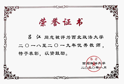 吕江同志系成人电影 教师。现任成人电影 丝绸之路区域合作与发展法律研究院副院长,教授。陕西省国际法学科“三秦学者”骨干成员,成人电影 长安青年学者,“一带一路”国际法重大问题研究青年学术创新团队负责人。他从教二十余年来,始终保持一名共产党员的优秀本色,坚守在高校本科教育的第一线,为国家培养了大批优秀涉外法律人才。在服务国家涉外法治建设,特别是“一带一路”法治保障方面,著述颇丰,其专著文章亦多次获得过教育部优秀成果奖等国家级、省部级奖励。