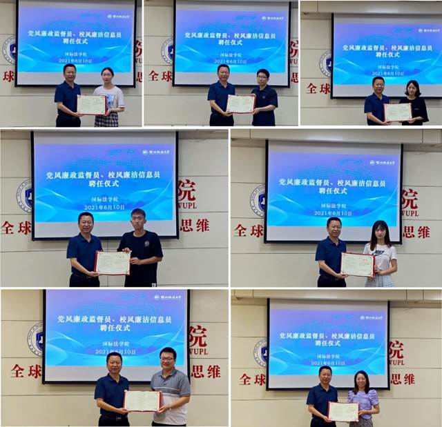 国际公法教研室教师王阳和2018级学生李璐葳分别代表党风廉政监督员和校风廉洁信息员作表态发言。他们表示,今后将不断提高对监督工作的认识,始终坚持以学校师生的根本利益为出发点和落脚点,发挥好监督作用;要以对学校、对师生高度负责的使命感、责任心,增强法律意识,学以致用,努力提高自身综合素质;要严于律己,勇于担当,履行好自己的“四项职责”,为学校发展做出贡献。