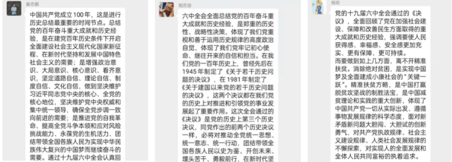 支部成员积极就学习十九届六中全会公报内容及精神展开交流。大家一致表示,作为新时代青年,要从百年党史中汲取不懈奋斗的力量,更加坚定、更加自觉地践行初心使命,勇担时代责任,敢做时代先锋,认真学习党的百年奋斗重大成就和历史经验,坚定对实现中华民族伟大复兴中国梦的信心,苦练本领、增长才干,早日成长为社会主义现代化的建设者和接班人。