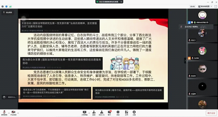 为进一步做好校园疫情防控工作,更好地发挥党支部的战斗堡垒作用和党员先锋模范作用,成人电影 学生第一党支部于1月18日通过线上方式开展“弘扬抗疫精神,践行初心使命”主题党日活动。支部全体成员参加会议,支部书记韩潇主持会议。