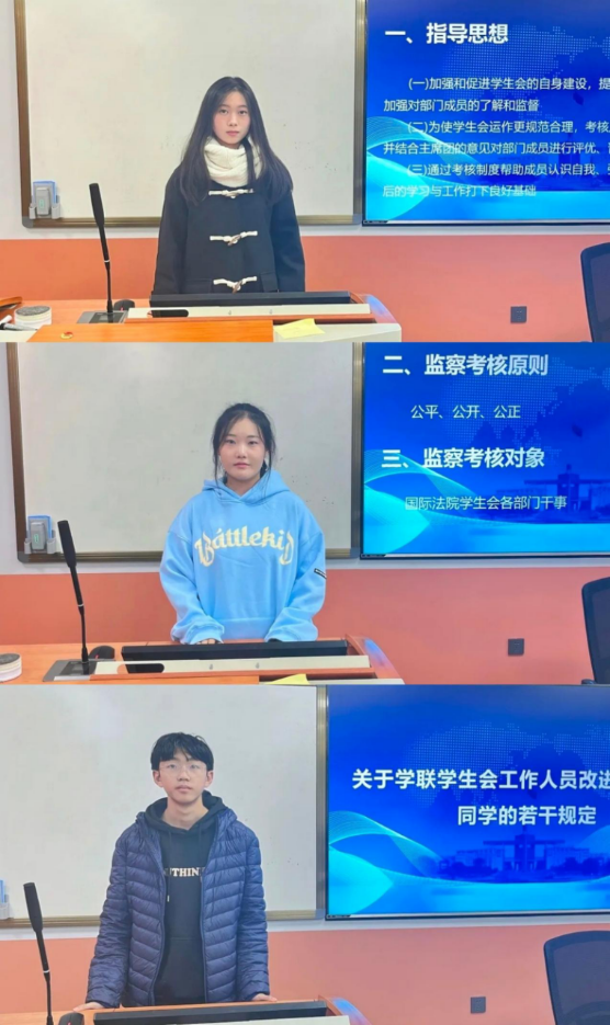 会议伊始,学生会轮值主席汤浩然、秘书处部长广悦妍、实践部部长康子悦、文体部部长李默轩从学生会改革实施方案、学生会的工作规定、作风建设和监察考核四个方面展开介绍,便于大家更好的了解学生会的运行机制和组织原则。