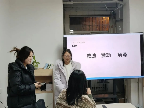 主持人将同学两两分组,一名学生背对黑板,另一名同学根据情绪词语,利用自己的表情和动作进行表演。在进行表演和猜测的过程中,同学们不仅可以放松身心还能够体会情绪表达的重要性。