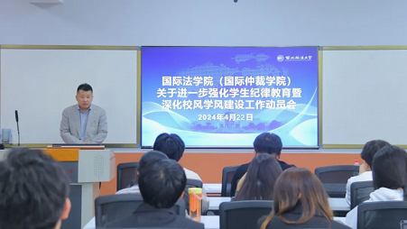 为培养具有国际视野和专业素养的法律人才,通过规范化管理和落实相关制度加强学风建设,提升教育水平和素质教育转型,成人电影 (国际仲裁学院)于4月22日19:30在涉外法治基地举行关于进一步强化学生纪律教育暨深化校风学风建设工作动员会,本次会议由团委书记徐秉鹏老师主持,团总支书记苏芝双老师,教务科长张毓慧,教务秘书王艺潜和成人电影 (国际仲裁学院)各年级代表参会。