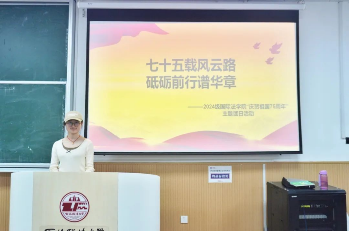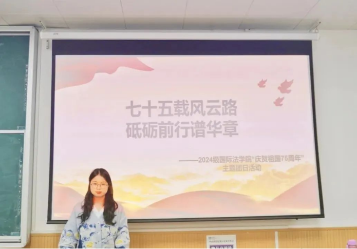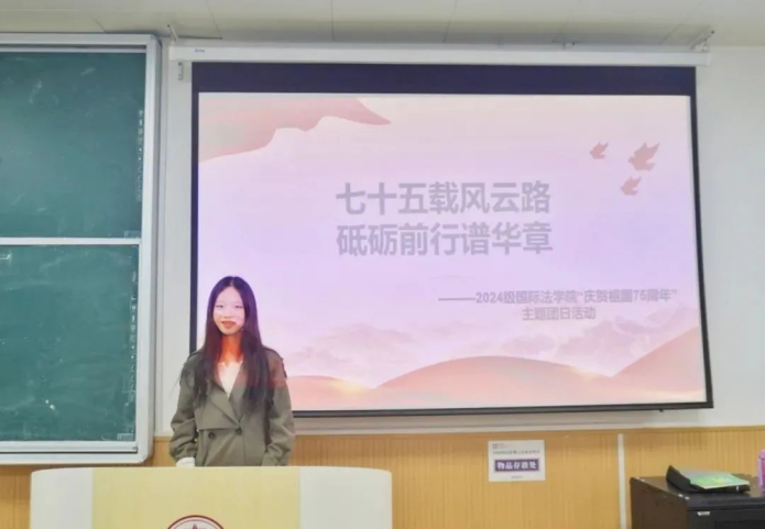 为弘扬伟大爱国主义精神,增强同学们的民族自豪感和责任感,10月28日,成人电影 (国际仲裁学院)于AJ21教室举行“庆贺祖国75周年”主题团日活动,由2024级辅导员黄思齐组织,各班团支书主持,全体2024级学生参加。