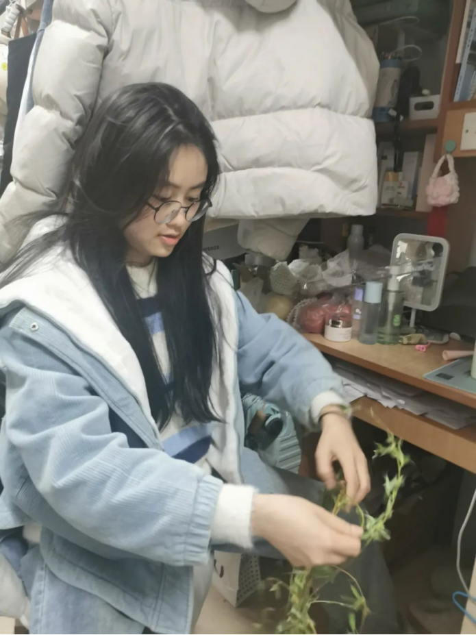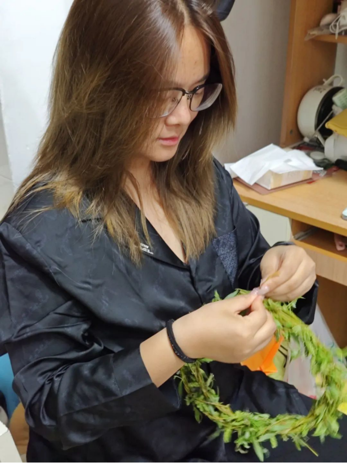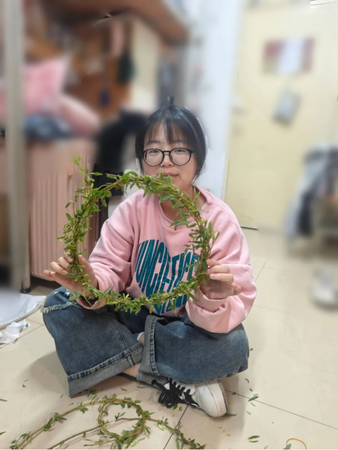 活动伊始,在团支书与班长的有序组织下,同学们以宿舍为单位开启了庄重而富有意义的柳环编织之旅。宿舍内大家围坐成一团,彼此间交流着编织技巧与心得,现场充满了热烈而和谐的气息。大家手中的柳枝在灵活的指尖下宛如灵动的精灵般弯折缠绕,嫩绿欲滴的柳叶不仅是自然生机的象征,更凝聚着同学们的心血与真挚情感,寄托着对烈士跨越时空的深切怀念。