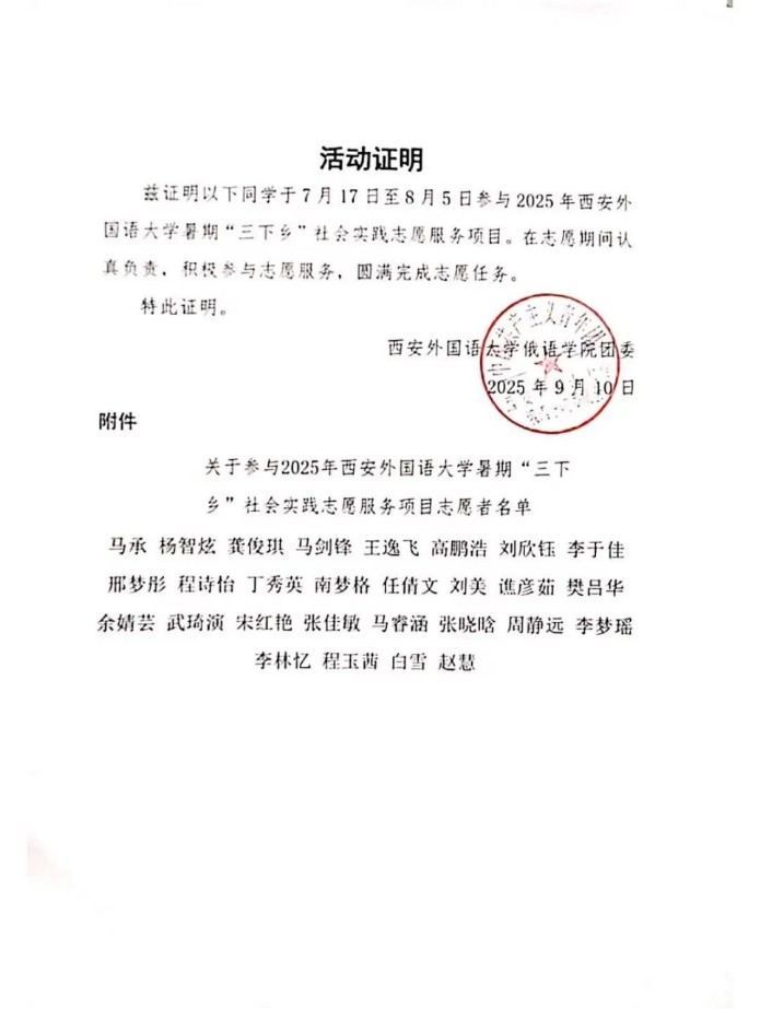 但伴随着学院中俄暑期交流营的“三下乡”社会实践志愿活动,我与来自俄罗斯的同龄人一起共度了14天的研学时光。在与俄罗斯同龄人朝夕相处的实践中,我第一次将书本上的俄语用于真实交流,深切感受到了语言的魅力与应用的乐趣。这段经历驱散了我的迷茫,让我重拾了对两个专业的学习信心。