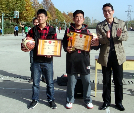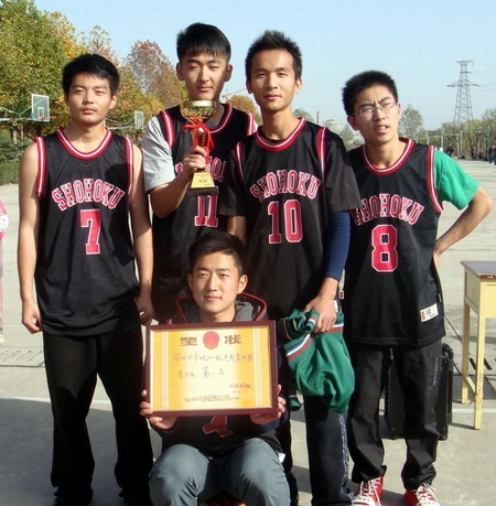 颁奖仪式结束后,运动员们和颁奖老师合影。本届篮球赛在同学们欢呼声中落下帷幕。