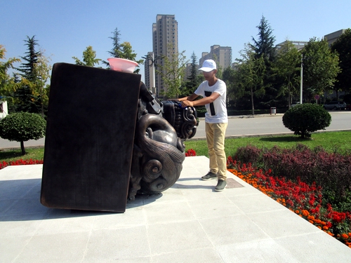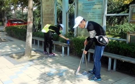 的志愿者们的身影。他们将散落在草坪中的垃圾收入塑料袋,将湖区的石凳、候车区的座位清洗干净。活动的第二天,志愿者们继续第一天的服务工作,虽然工作跟头一天一样,但他们依旧认真努力。