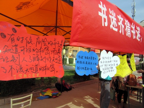 特别设置了读书节趣味猜书谜活动。活动中,工作人员事先在通往教学区的道路两旁及摊位处张贴了许多写有书谜的小卡片,猜出谜底的同学均可持卡片在活动摊位处领取精美礼品。活动得到了中同学们的热情参与,尽管设置的谜题涵盖面很广,任然不断有同学猜对谜底领取奖品,现场十分热闹。参与活动的同学中有许多表示,自己阅读量还不足,很多谜自己都不会。