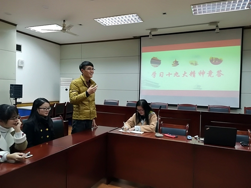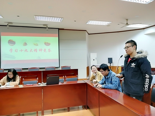 为深入学习宣传贯彻党的十九大精神,加深支部党员对于十九大的知识的了解,在本次十九大精神学习活动中,组着支部党员分成两个小组,进行“十九大精神知多少”知识竞答。竞答题目源于十九大报告内容,包括:我国社会主要矛盾、新时代中国共产党的历史使命、三个“必须”、新时代中国特色社会主义发展的“两个阶段”战略安排、建设现代化经济体系的六大任务等十多个问题。