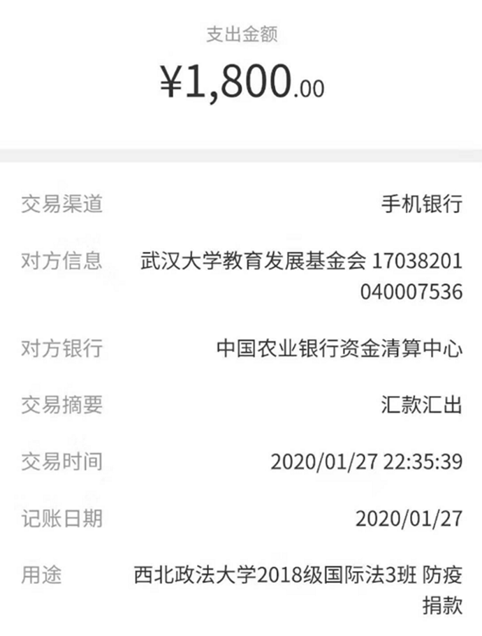 2020年1月25日大年初一,班里同学开始自愿捐款,最终在同学们的共同努力下,一共募捐到1800元人民币,并将全部捐款如数汇到了武汉大学西安校友会的账户上。