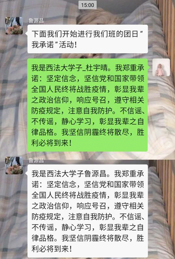 疫情被隔离,但是人心永远团结在一起。在班委会成员的带领下,同学们共同承诺,做好个人防护工作,为防疫工作贡献自己的力量。“