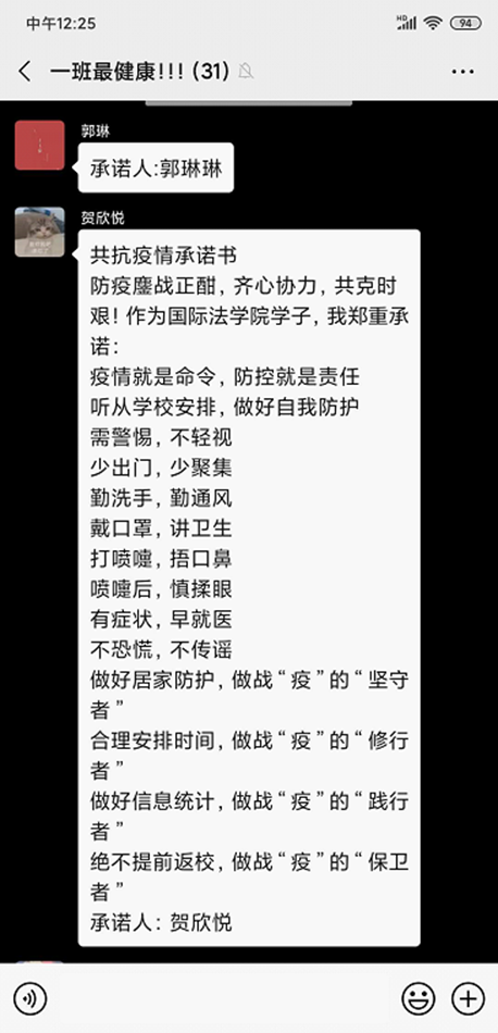 在给大家传阅了我校递发给大家的倡议书后,2017级1班团委又接连分享给大家一些先行有效的防疫手段以提高大家居家时的防疫效率。随即,班团委们编辑了承诺函一份,在大家穿越后号召大家签字以表明作为团组织成员配合成人电影 院团委工作的决心,承诺函全文如下: