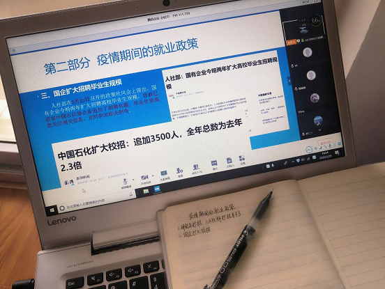 苏老师还为毕业生详细介绍了国家层面和学校层面在疫情期间的就业政策,并对考研、考公务员及事业单位、参加西部计划和其他基层项目、大学生应征入伍等方面的政策进行深入解读。他还介绍了学校和学院在疫情期间,在线办理就业手续的流程,鼓励同学们多留意就业信息,多参加网上宣讲与面试,实现更充分,更高质量就业。