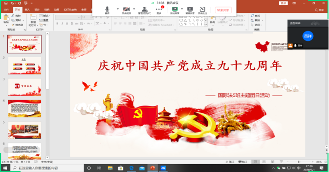 2019级一班采用微信方式进行此次团活动。团支书陈语嫣带领同学们回顾党的光辉历史,组织班级成员一同观看了共青团中央发布的视频《中国共产党,生日快乐》和纪录片《伟大的历程》,极大地凝聚了同学们爱国爱党的思想热情,进一步促使同学们坚定了“坚持党的领导”的思想信念,提高了同学们思想觉悟。2019级四班在腾讯会议上共同学习微党课《党旗飘扬筑牢红色围墙》。党课围绕疫情、一带一路建设等内容来讲述,使同学们看到了新时代下的青年是如何怀着高度热忱投入到国家各项事业的第一线,并以此激励自己。每一位同学在观看后都纷纷写下了心中的情感流露。其中张敏同学更是联系自身在抗疫中的志愿者经历,发出了“青年学生应身体力行践行习总书记号召传递青春正能量”的感言。