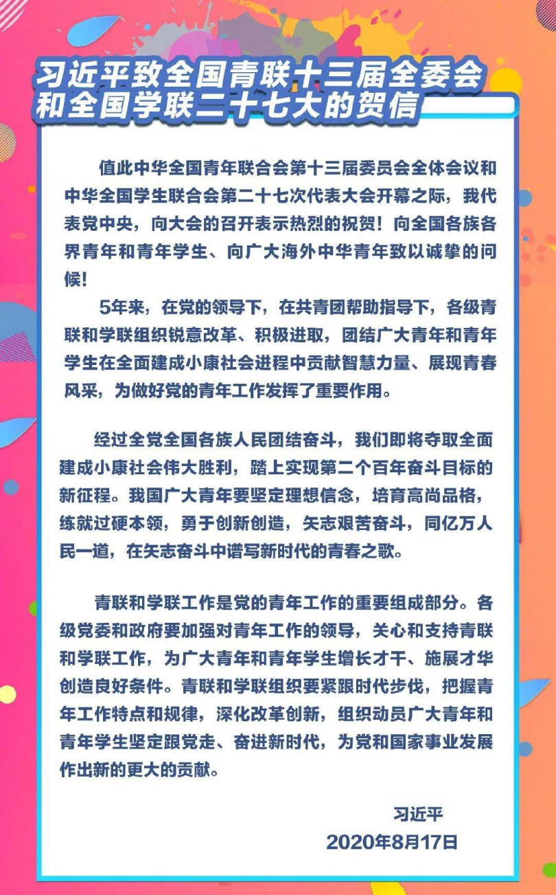 中华全国青年联合会第十三届委员会全体会议、中华全国学生联合会第二十七次代表大会于8月17日上午在京开幕。中共中央总书记、国家主席、中央军委主席习近平发来贺信,代表党中央向大会的召开表示热烈的祝贺,向全国各族各界青年和青年学生、广大海外中华青年致以诚挚的问候。
