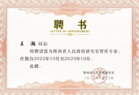 我校国际法学科带头人、国家智库基地涉外法治研究中心执行主任、首席专家王瀚教授被聘任为陕西省人民政府研究室智库专家,聘期自2023年10月至2025年10月。