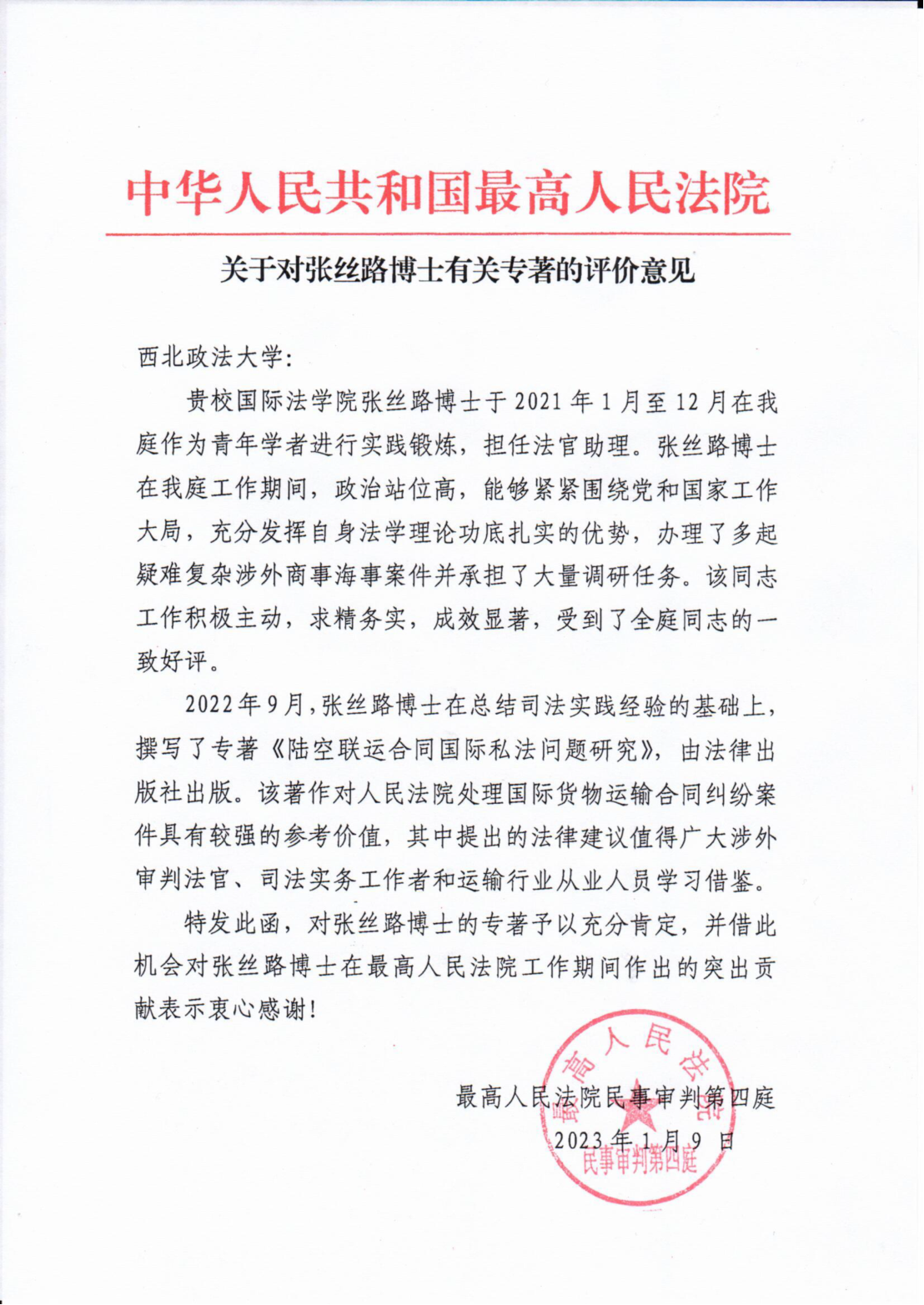 近日,成人电影 国际私法教研室张丝路博士的专著《陆空联运合同国际私法问题研究》获最高人民法院民事审判第四庭肯定性评价。最高人民法院民事审判第四庭在来函中对张丝路博士在挂职锻炼期间的工作表示感谢,充分肯定张丝路博士的专著对于处理国际货物运输合同纠纷案件的参考意义,并对张丝路博士的专著作出肯定性评价。