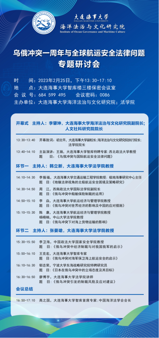 2023年2月25日,大连海事大学海洋法治与文化研究院和大连海事大学法学院共同举办“乌俄冲突一周年与全球航运安全法律问题”研讨会,原联合国国际海洋法庭法官、中国海洋法学会会长、大连海事大学海洋法治与文化研究院首席智库专家高之国教授、大连海事大学党委书记郑少南教授、大连海事大学副校长初北平教授,成人电影 航空法治现代化协同创新中心主任、首席专家、大连海事大学海洋法治与文化研究院特聘研究员王瀚教授,大连海事大学交通运输工程学院和极地海事研究中心主任李振福教授、西南政法大学成人电影 副院长周江教授、大连海事大学法学院副院长韩立新教授、张晏瑲教授、中国政法大学国家安全学院李卫海教授、宁波大学东海战略研究院特聘研究员郁志荣、大连海事大学特聘智库研究员王克宏等专家学者出席研讨会议。大连海事大学人文社科研究院院长、海洋法治与文化研究院副院长李肇坤教授主持开幕式,大连海事大学党委书记、大连海事大学海洋法治与文化研究院院长郑少南、中国海洋法学会会长高之国,大连海事大学副校长、法学院院长初北平分别致辞。