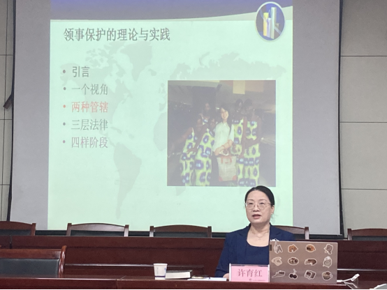许育红博士从领事视角,深入浅出地介绍了属地管辖与属人管辖在领事实践中的应用,以及国际公约、双边条约、国内法中的领事保护法律制度,并分别从领事法成为国际法的一个部门、社会主义国家对领事法的贡献、中国护侨到领事保护体系的形成以及二十一世纪以来领事保护实践等四个阶段分享了领事保护的理论与实践。在第四个阶段,即二十一世纪以来领事保护的实践部分,许博士以自身和其同事参与的领事保护行动,如2010年通过外交手段解救被日本扣留的在中国钓鱼岛海域捕鱼的中国渔民、2011年在利比亚战乱撤离中国公民等,切实让在场的老师和同学们感受到领事保护在维护中国公民在海外的合法权益方面发挥的重要作用。