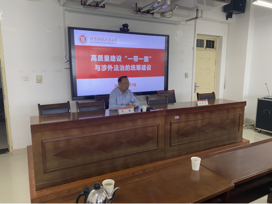 2023年6月17日,应法学院邀请,成人电影 丝绸之路区域合作与发展法律研究院院长、二级教授、博士生导师王瀚到学院作学术讲座。国际法教研室王国锋副教授主持。袁松副教授、崔航博士以及学生30余人参加本次讲座。