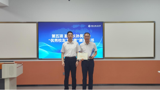 孙昊亮为“优秀校友工作者”万商天勤律师事务所主任卫永鹏和陕西秦石律师事务所主任田磊颁发证书。