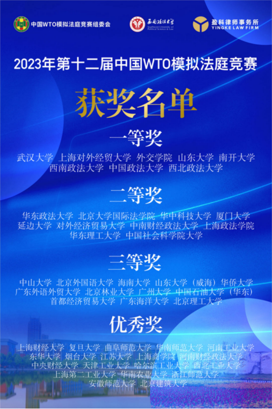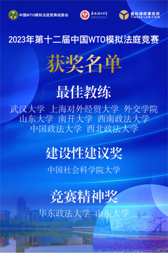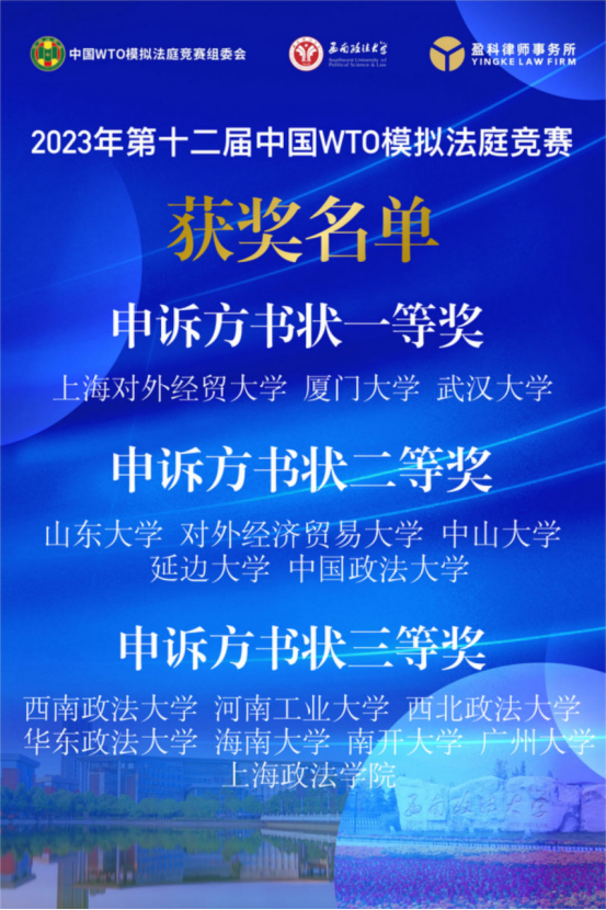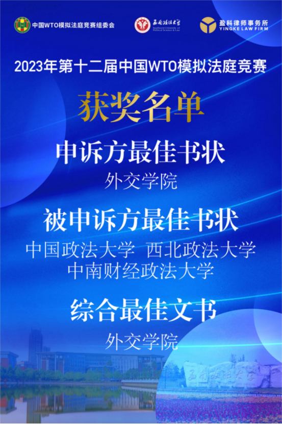 2023年12月11-17日,由中华人民共和国商务部条法司、中国法学会WTO法研究会、中国政法大学和西南政法大学共同发起,西南政法大学承办的第十二届“中国WTO模拟法庭竞赛(全英文)”在线上和线下隆重举行。我校及中国政法大学、武汉大学、北京大学等49所高校参加了这一国内WTO领域最高级别的法学竞赛。经过激烈角逐,我校代表队荣获全国一等奖,同时荣获“被诉方最佳书状”奖、“最佳教练奖”。