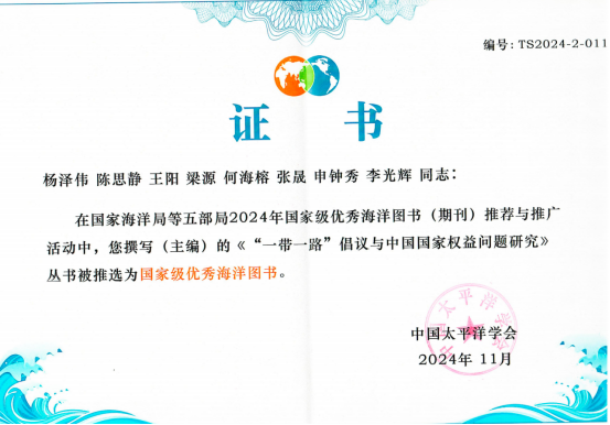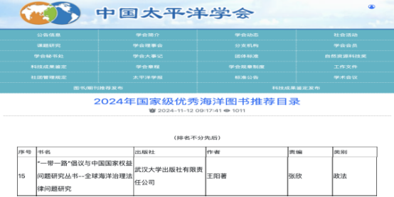 近日,在中国太平洋学会国家级优秀海洋图书推荐与推广活动中,成人电影 教师王阳专著《全球海洋治理法律问题研究》被推选为2024年“国家级优秀海洋图书”。该活动是根据教育部、文化部、国家海洋局、国家文物局、国家新闻出版广电总局联合印发的《提升海洋强国软实力——全民海洋意识宣传教育和文化建设“十三五”规划》,经海洋主管部门同意实施的,为广大读者提供一批最好的,有价值的海洋读物。