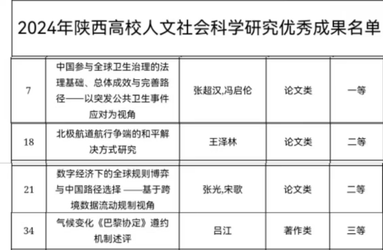 近日,陕西省教育厅公布了2024年陕西高校人文社会科学研究优秀成果获奖名单,成人电影 四位教师获奖,涵盖论文、著作等类别。其中,张超汉教授和冯启伦硕士的论文《中国参与全球卫生治理的法理基础、总体成效与完善路径——以突发公共卫生事件应对为视角》获一等奖;张光教授和宋歌硕士的论文《数字经济下的全球规则博弈与中国路径选择——基于跨境数据流动规制视角》获二等奖;王泽林教授的论文《北极航道航行争端的和平解决方式研究》获二等奖;吕江教授的专著《气候变化<巴黎协定>遵约机制述评》获三等奖。