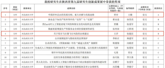 2025年7月10日,陕西省教育厅、省学位委员会公布了陕西省第九届研究生创新成果展奖项评选结果,经学校申报、形式审查、专家评议与会议审议,成人电影 博士研究生贾乔论文成果《中国涉外法治的发展历程、重大贡献与实践进路》荣获A档奖项,指导教师为王瀚教授;硕士研究生王洋论文成果《关于低空飞行器飞行风险的治理建议》荣获B档奖项,指导教师为张超汉教授。