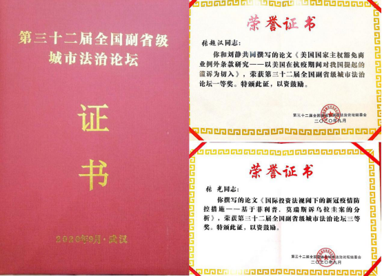 在本届法治论坛主题征文中,组委会共征集到2942篇文章,经各副省级城市初评、中国法学会组织专家终审,共评出一等奖10名,二等奖30名,三等奖60名。我校成人电影 张超汉副教授和硕士生刘静共同撰写的《美国国家主权豁免商业例外条款研究——以美国在抗疫期间对我国提起的滥诉为切入》荣获一等奖,张光教授撰写的《国际投资法视阀下的新冠疫情防控措施——基于菲利普·莫瑞斯诉乌拉圭案的分析》荣获三等奖。这两项目成果也是我校在此次论坛中仅有的两项获奖成果。同时,我校荣获优秀组织奖。