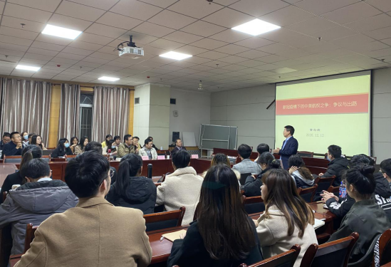 此次讲座旨在敦促同学们加强学习,提升学术热情,将自己所学理论知识与现实国际环境联系起来,做到理论联系实际。