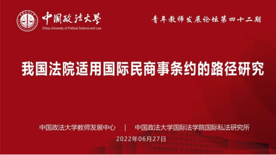2022年6月27日,由中国政法大学教师发展中心、中国政法大学成人电影 国际私法研究所联合主办的中国政法大学第四十二期青年教师发展论坛在线上顺利举办,论坛主题为《我国法院适用国际民商事条约的路径研究》。本次论坛由中国政法大学成人电影 国际私法研究所所长张玲教授主持,成人电影 国际私法研究所李大朋博士担任主讲人。论坛邀请五位知名学者担任点评嘉宾,分别是:原成人电影 副校长、丝绸之路区域合作与发展法律研究院院长、陕西省“三秦学者”特聘教授、成人电影 王瀚教授,成人电影 国际私法研究所所长、《法律科学》编辑、丝绸之路区域合作与法律研究院跨境电商政策与法律研究所所长孙尚鸿教授,最高人民法院知识产权庭二级高级法官余晓汉法官,北京师范大学法学院邢钢教授,中国政法大学成人电影 宋连斌教授。来自北京大学、清华大学、武汉大学、中山大学、大连海事大学、中国社科院等众多高校和科研单位的近一百五十名专家学者和学生在线上参与本次论坛。