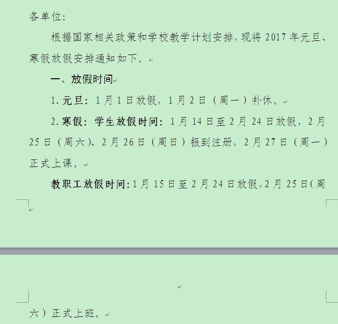 关于2017年元旦及寒假放假安排的通知